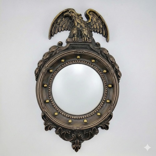 中央の凸面鏡(コンベックス・ミラー)は、かつて「バトラーズ・ミラー(執事の鏡)」と呼ばれた歴史的背景を持ち、魚眼レンズのように空間を広く映し出すことで部屋に独特の奥行きとアートな空気感を演出します。