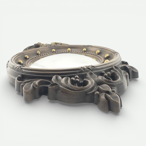素材にはSyroco社と同様の成型技術による硬質樹脂が使われており、重厚な木彫りの質感を再現しながらも軽量で扱いやすく、老舗メーカーならではの確かな品質と職人技を感じさせる完成度の高い壁掛けミラーです。