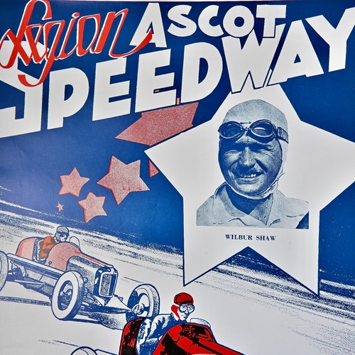 中央に大きくフィーチャーされているのは、1930〜40年代のアメリカン・モータースポーツ界を席巻した伝説のレーサー、ウィルバー・ショウ(Wilbur Shaw)です。 彼は世界三大レースの一つ「インディ500」で3度もの優勝(1937, 1939, 1940年)を成し遂げた歴史的スーパースターであり、のちにインディアナポリス・モーター・スピードウェイの社長としてレース文化そのものを救済した偉人でもあります。 このポスターは、彼がインディ500を初制覇する数年前の「若き日の姿」を捉えた、モータースポーツファンにはたまらない非常に熱い一枚となっています。