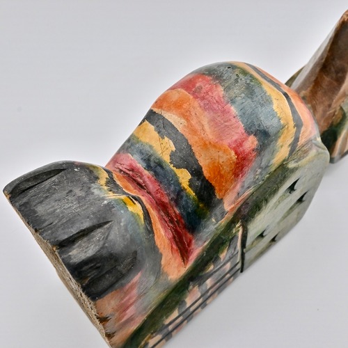 熱帯のオオハシをモチーフにしながらも、長い年月を経て褪色した赤や黄、緑の色合いが木肌と完全に同化し、古いネイティブアート特有の乾いた空気感と凄みを放っています。