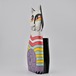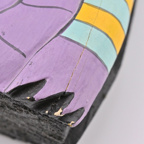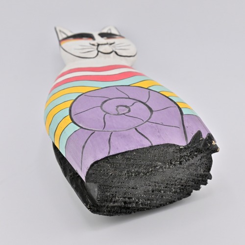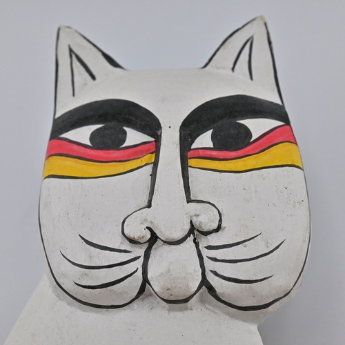 ハンドペイントによる、鮮やかでキッチュな色使いと、どこかユーモラスな表情が特徴的なフォークアートの一品。
