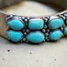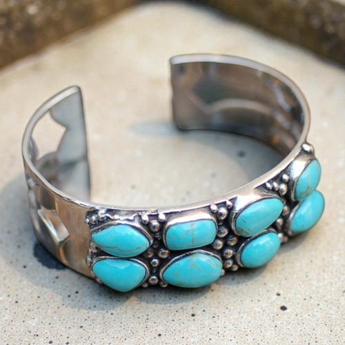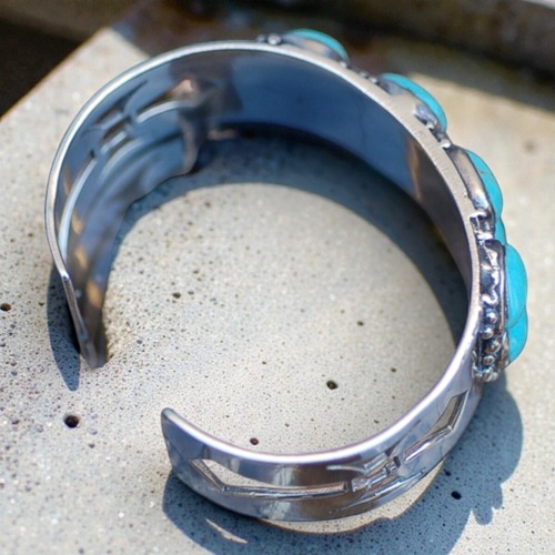 鮮やかなターコイズが連なるようにセットされた重厚なシルバーにサイドの鋭いクロス(十字架)の透かし彫りが施された非常にクールで洗練されたデザインとなっております。