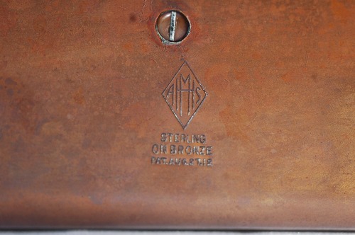 裏面には「HAMS」のロゴ、ダイヤモンドマーク、および特許取得日である「AUG. 27. 12(1912年8月27日)」の刻印が鮮明に確認できます。100年以上の時を経てなお、銀の装飾は剥がれることなく堅牢な状態を保っており、当時のクラフトマンシップの高さが伺えます。